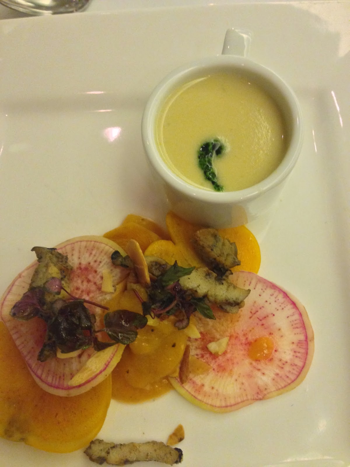 Chef came out of the kitchen, was introduced and the meal began. Abalone Bisque with an arugula puree offered pure essences of the ocean served in an espresso cup it was high on richness. The salad that accompanied it featured charred abalone salad with persimmons and Asian Pears, a dusting of almonds, and a spicy roasted dacron sliced thinly. This was a complex salad, with multi layers of flavor, all surprising and prepared impeccably.