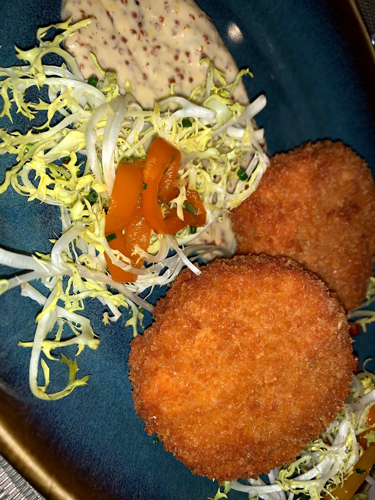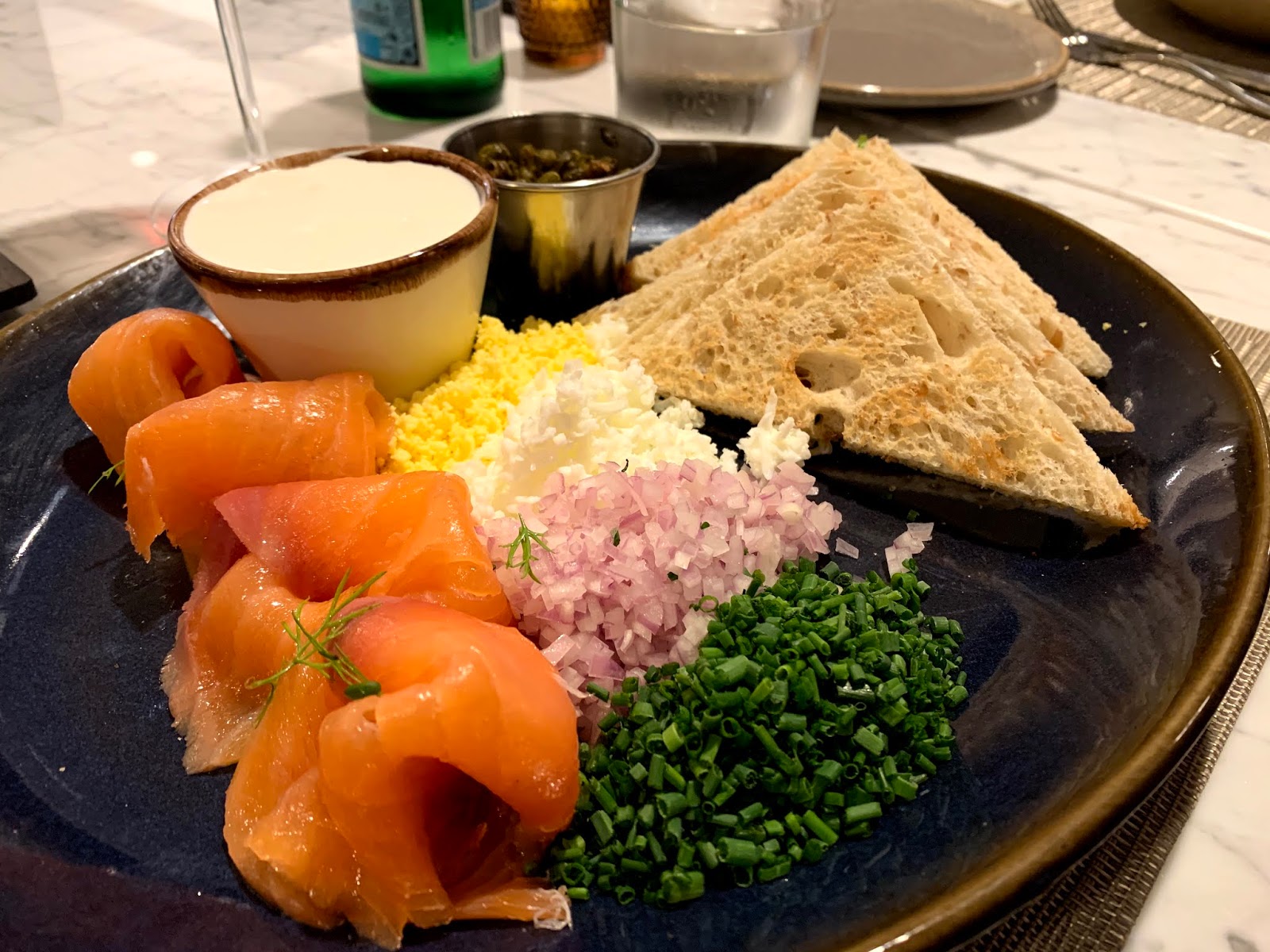 I started with the Smoked Salmon Toast Points. This was perfection in flavor and impeccable accouterments including fried capers, crème fraîche, grated hard eggs, red onions, and scallions.