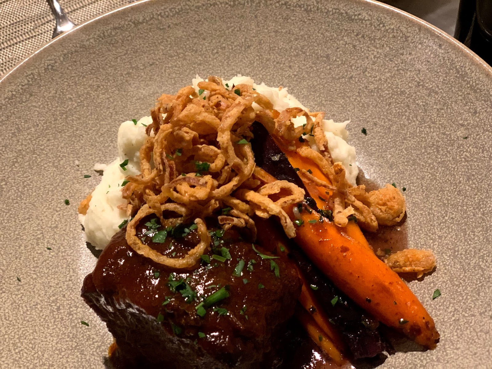 Gary’s dessert was a trio of chocolates. He went nuts for them. I ordered a bottle of 2014 Labyrinth Tempranillo, that is one of my favorite juices. We moved on to Crab Cakes which were dense with crab. I would have liked a remoulade sauce with them, I found the sauce too mild.